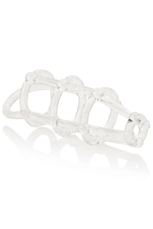 Add inches in length with the stretchy penis extension, ribbed inside and out for mutual pleasure, or experiment with the super-stretchy cock cage, which offers support and stimulation during play.