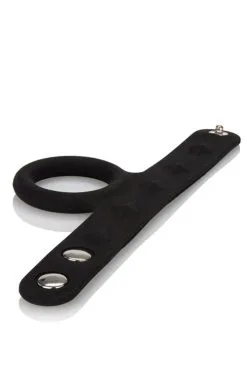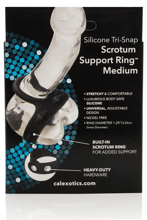 This stretchy silicone scrotum support ring offers erection enhancement and support. Comfortable to wear the three-snap design is fully adjustable.