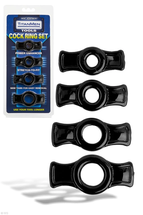 Enhance your member with the most convenient and manageable cock rings available. These TitanMen Tools Cock Rings stretch to fit with the aid of easy to grip side tabs. Each set contains 4 rings ranging in size from 0.4” to 0.75” un-stretched.