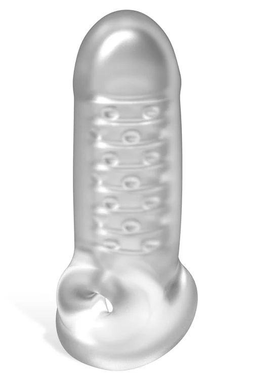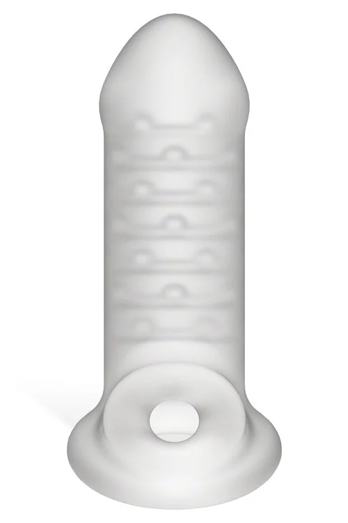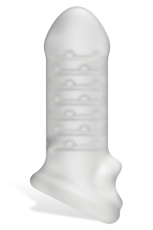 The sheer frosted material offers visual stimulation and is teasingly ribbed and studded on the inside for even more wearer satisfaction.
